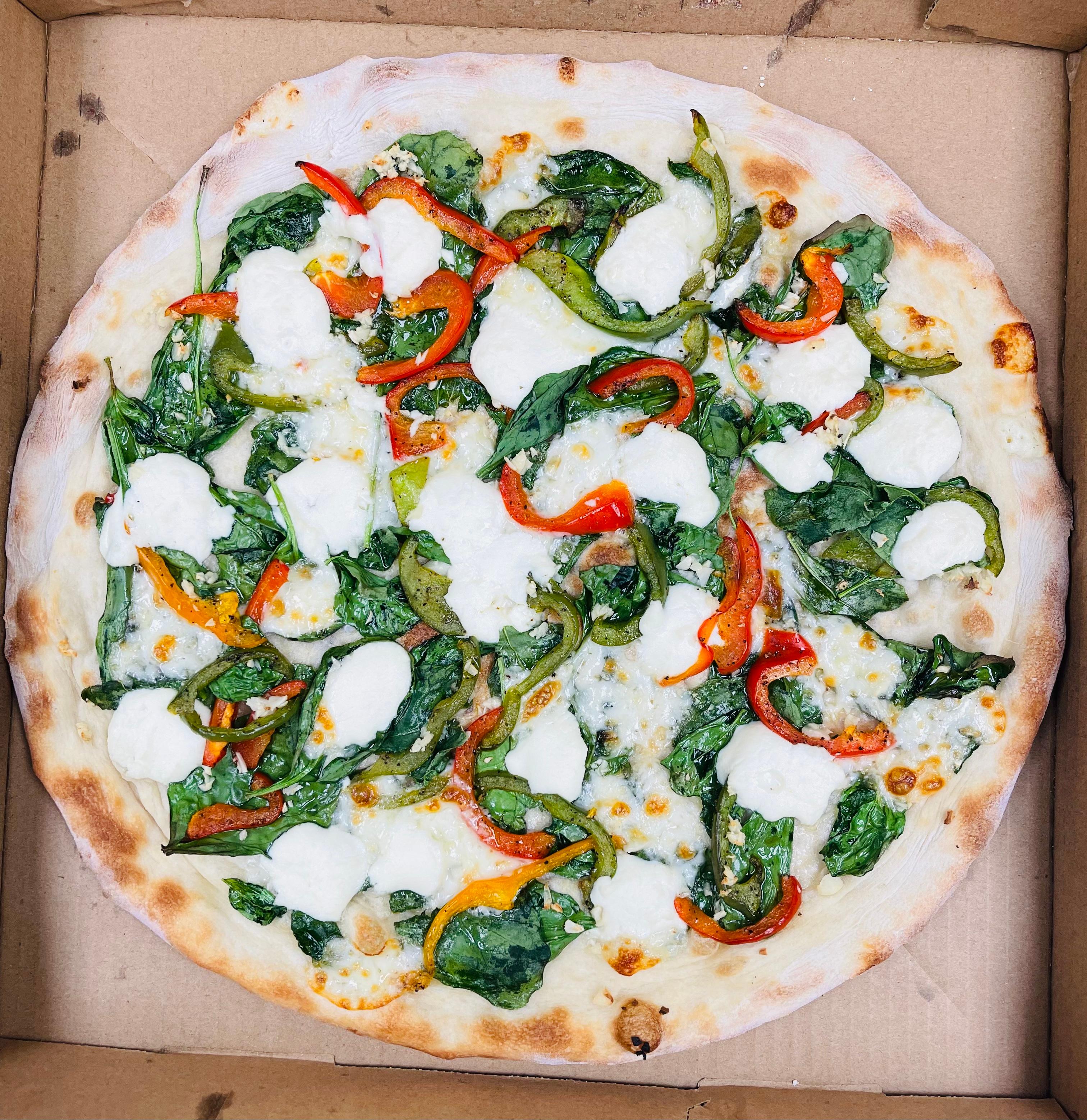 Extra Virgin Olive Oil, Mozzarella Cheese, Fresh Spinach, Mix bell Peppers, Ricotta Cheese, a sprinkle of Black Pepper And Parmesan Cheese.