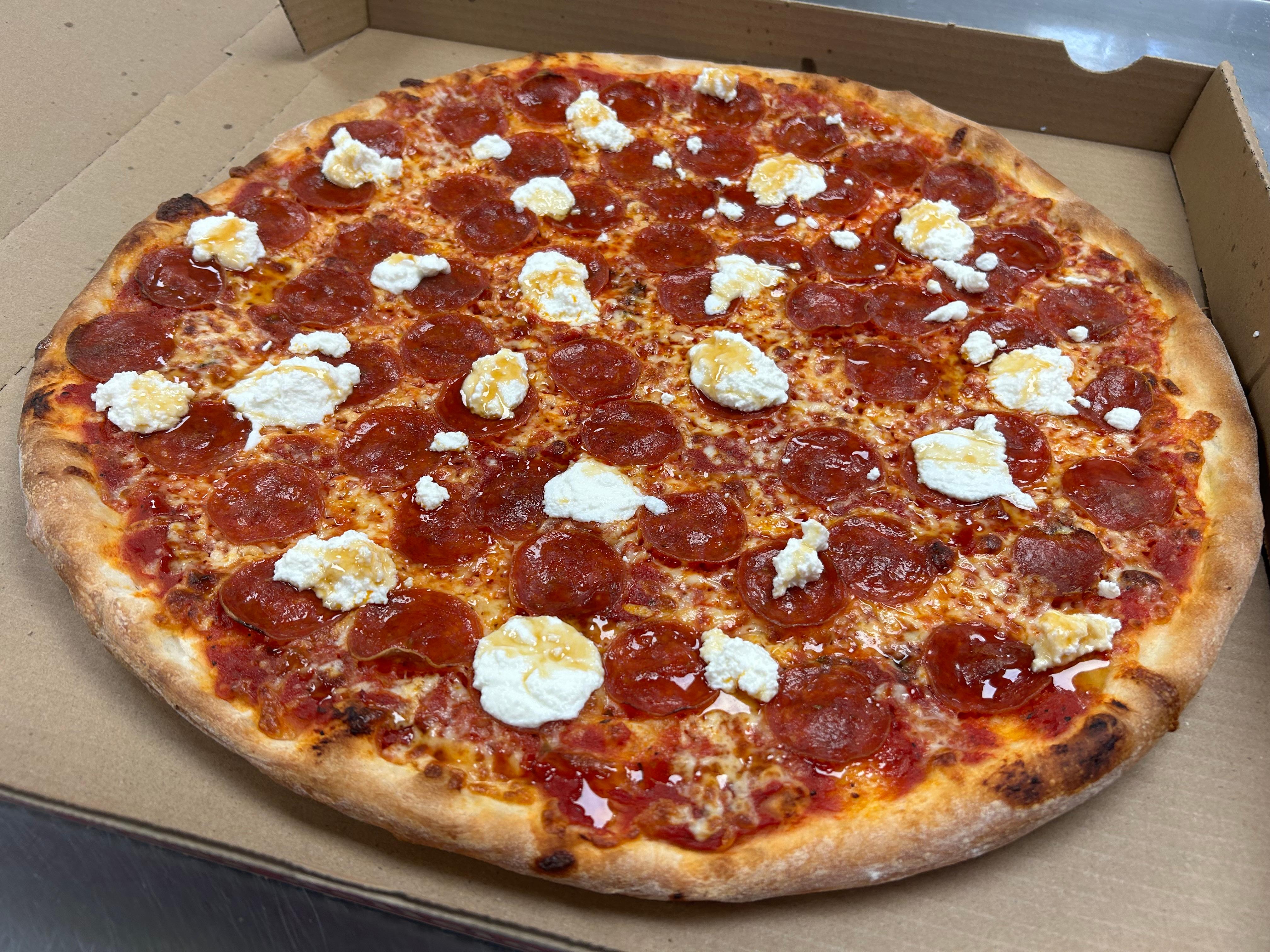 Red Sauce, Mozzarella Cheese, Hot Honey, Pepperoni, Ricotta Cheese.