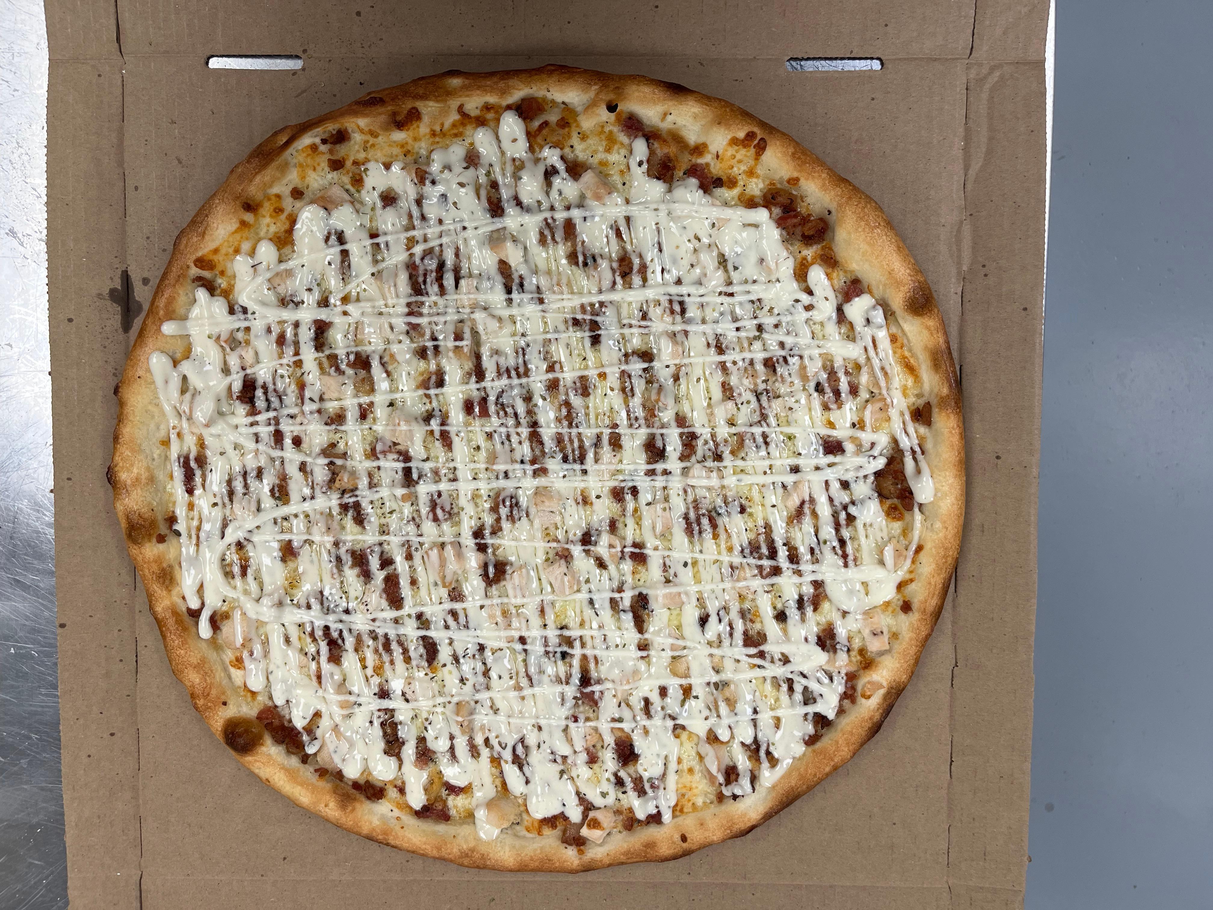 Mozzarella Cheese, Chicken, Bacon, Ranch Drizzle.( the sauce on this pizza is the ranch, expect a decent amount of it)